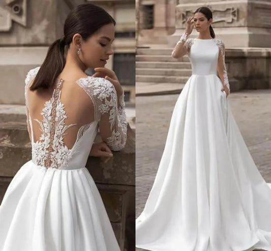 Exquisite A-line Wedding Dress 2026 Boat Neck Long Sleeves Illusion Back Buttons Embroidery Lace Applique Bride Bridal Gowns