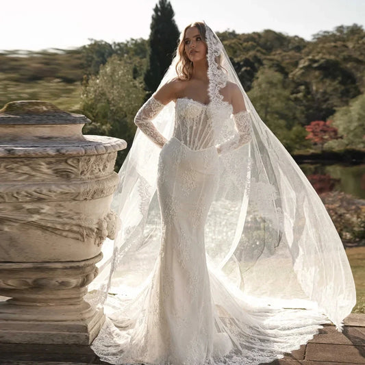 Elegant Mermaid Wedding Dresses Strapless Long Sleeve Lace Embroidery Bride Dress Bridal Gowns Court Train Vestido De Novia