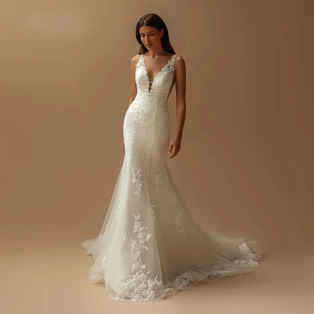 Charming V-Neck Wedding Dresses Sexy Lace Appliques Spaghetti Strapes Backless Mermaid Bridal Gown Vestido De Novia