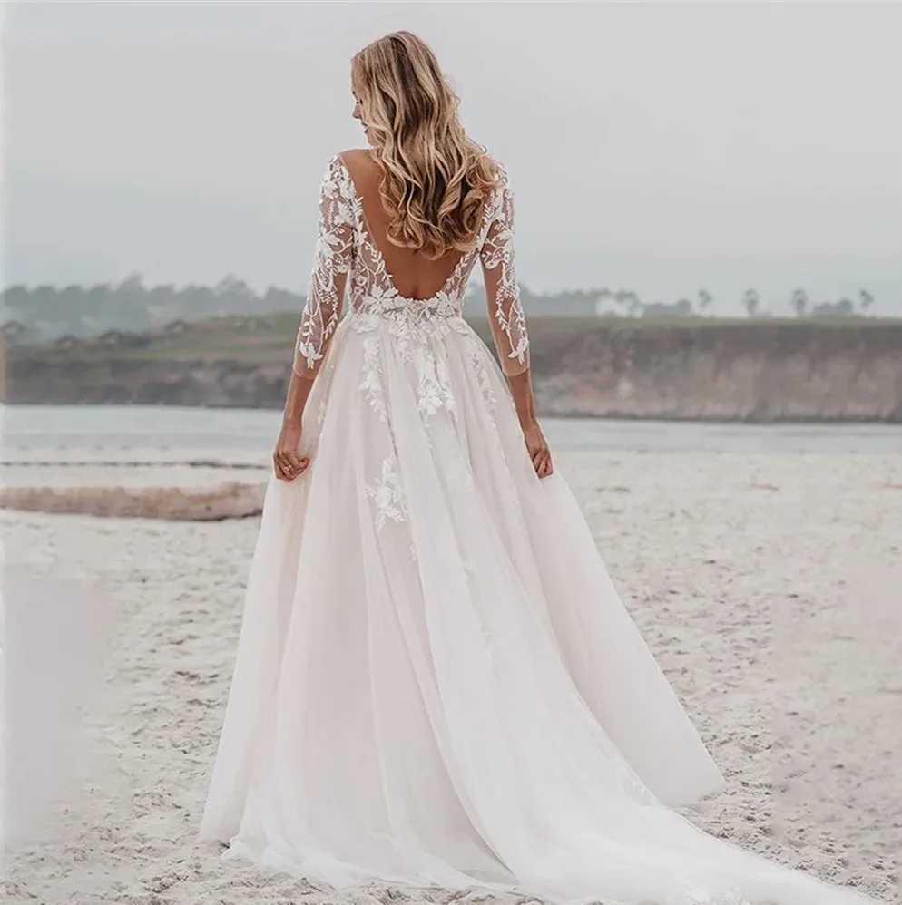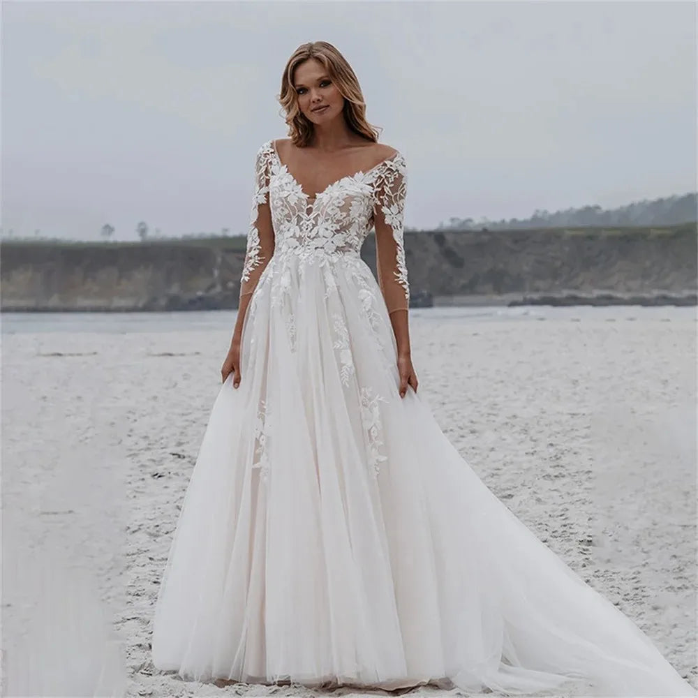 Classic A-line Wedding Dress V-neck Sleeves Lace Appliques Backless Tulle Princess Bridal Gowns Boho Garden Vestidos De Noiva