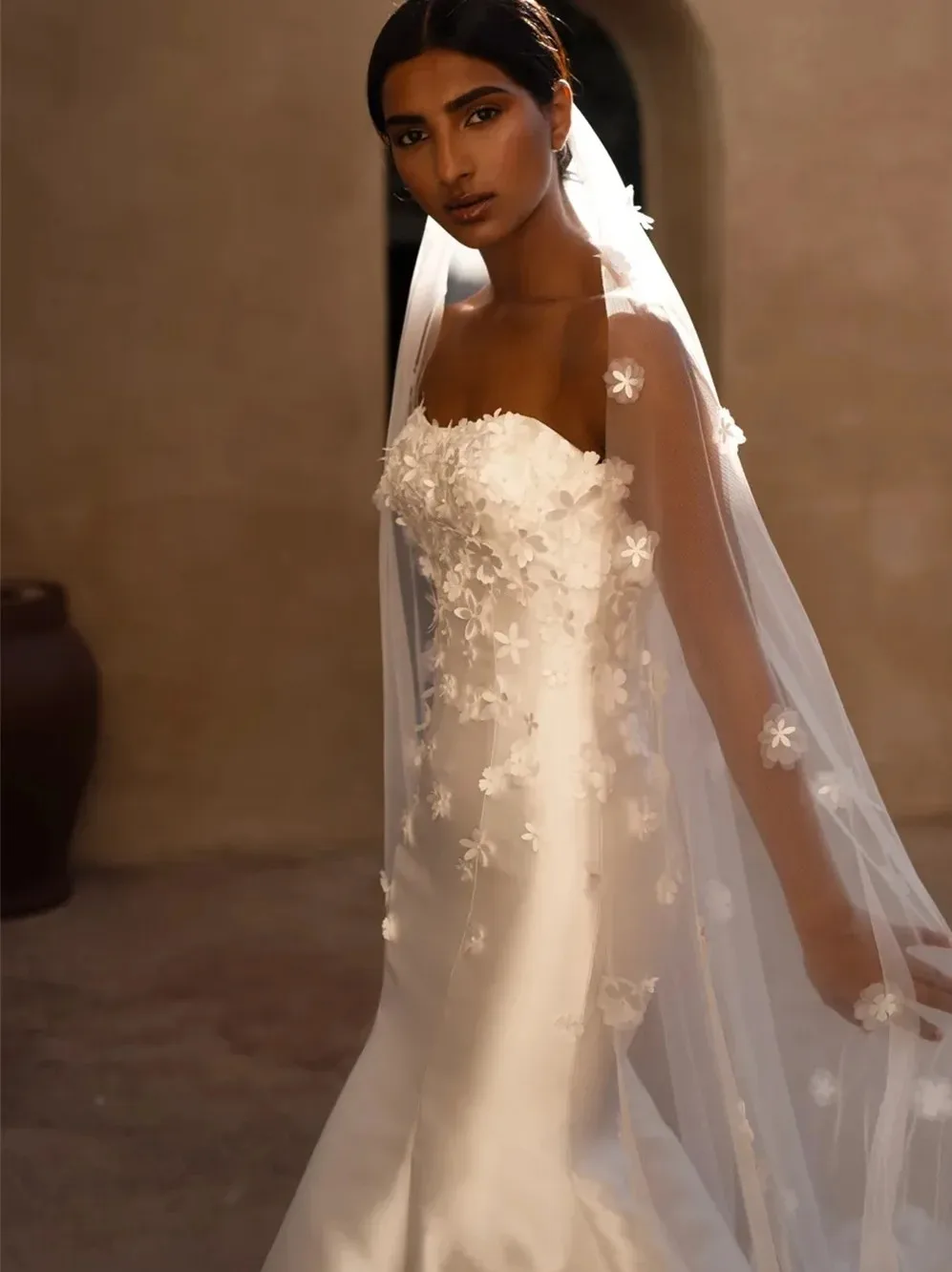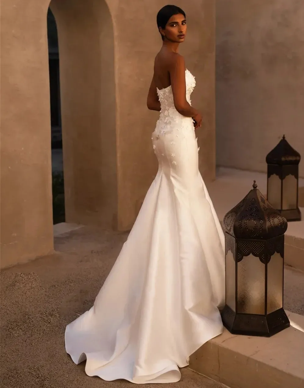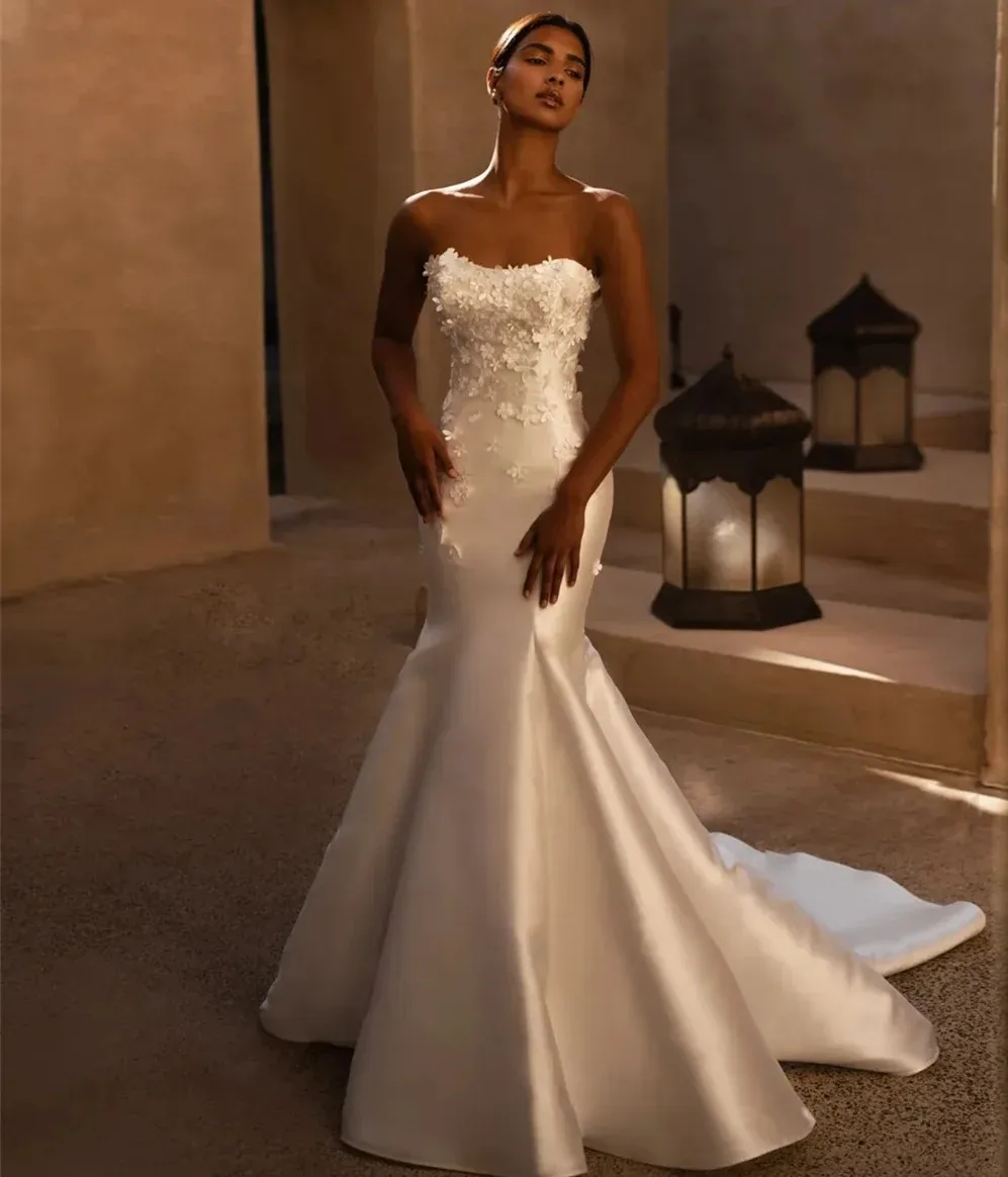 Classic Mermaid Wedding Dress Strapless 3D Flowers Satin Sweep Train Bridal Gown Elegant Bridal Dress Brides Vestido De Noiva