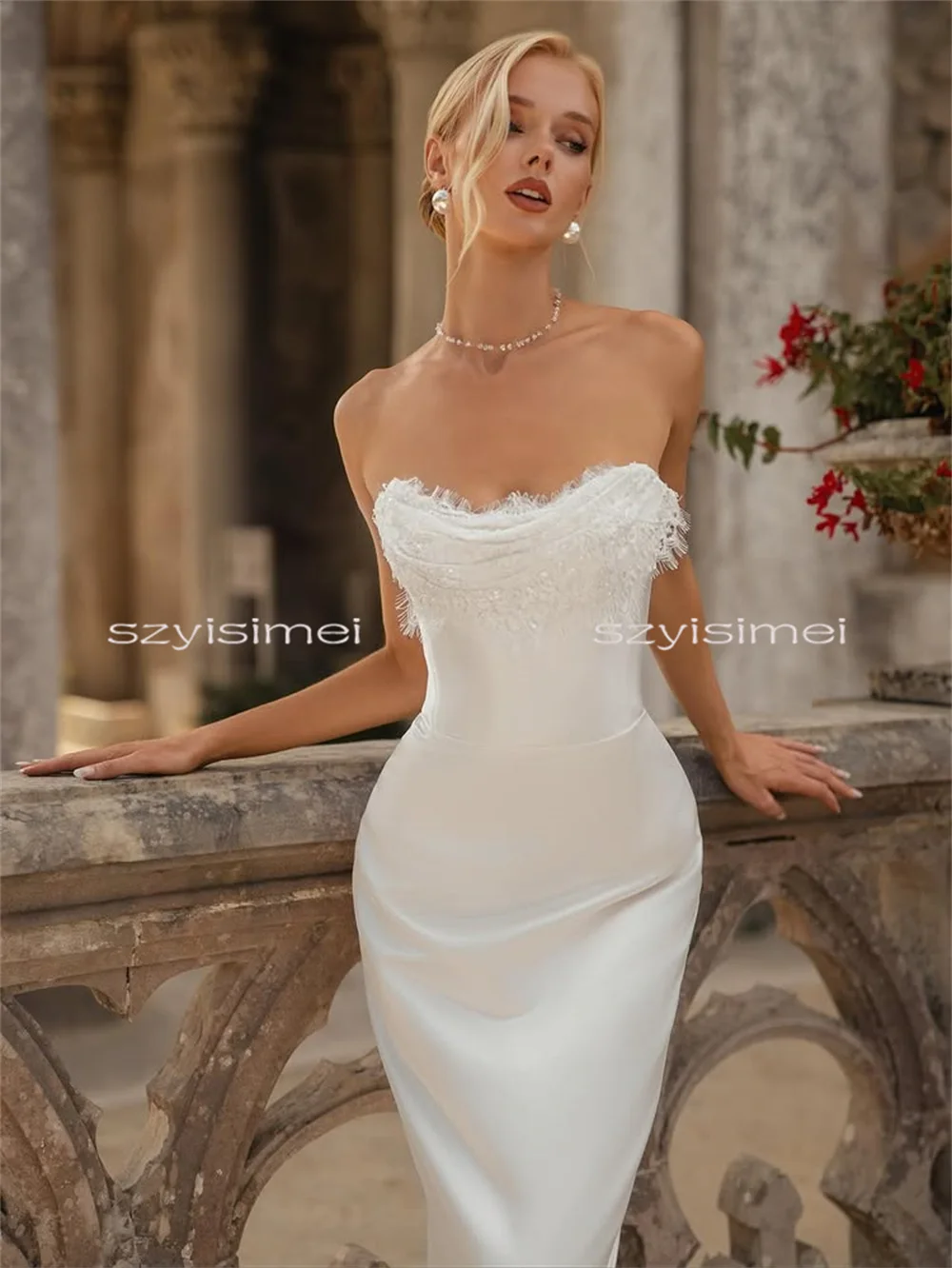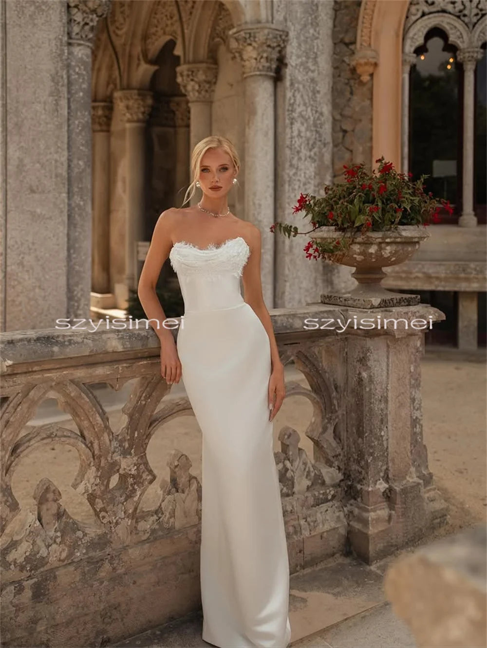 Crafted from premium polyester satin, this dress offers a luxurious feel and stunning sheen for your special day.