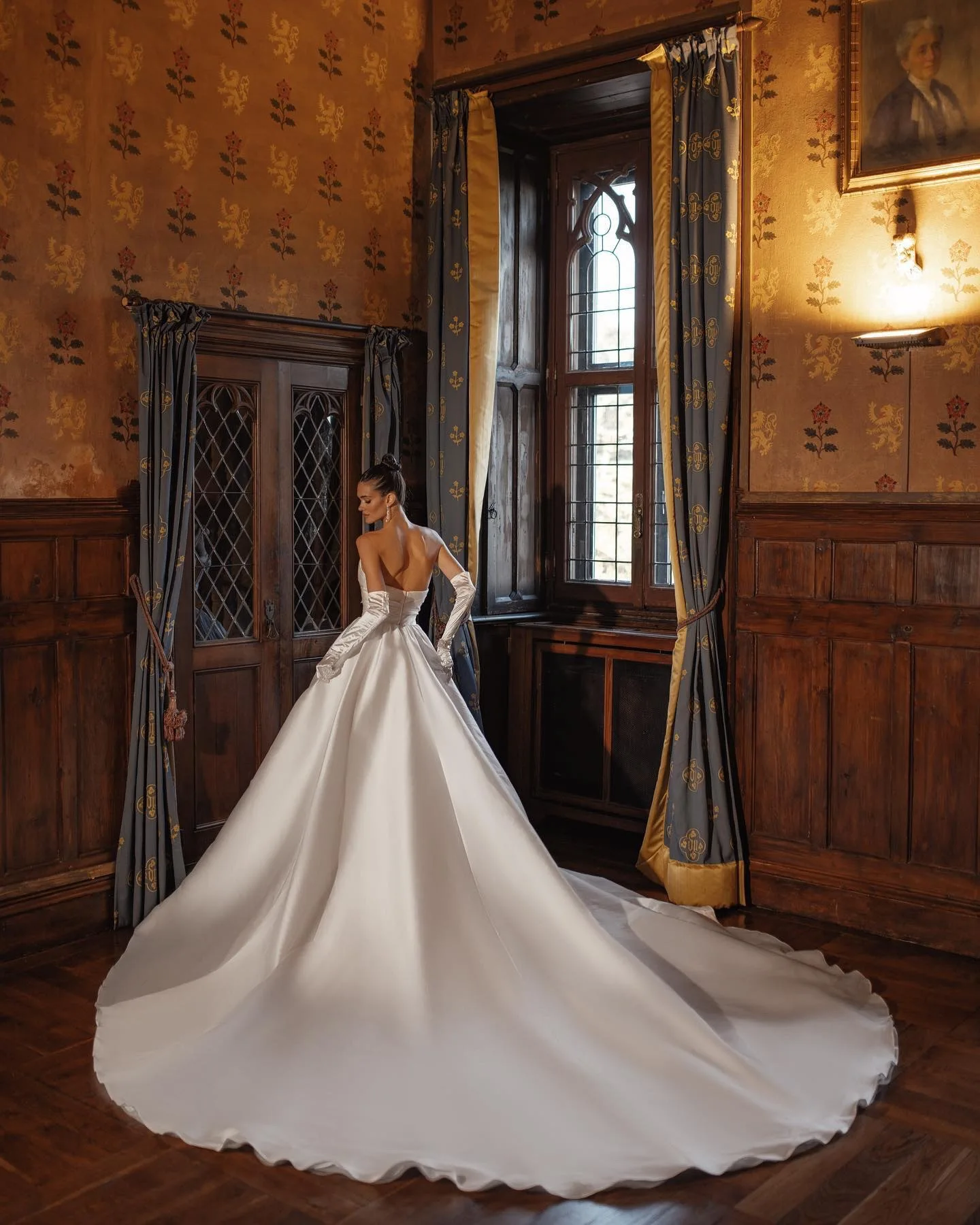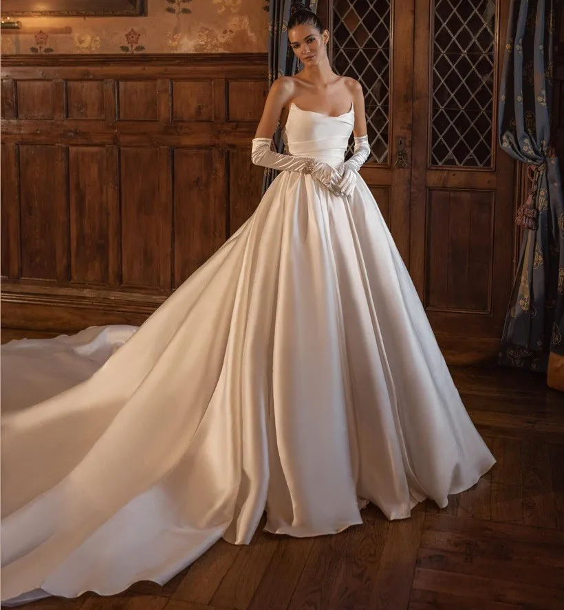 Elegant A-Line Church Wedding Dress Strapless Pleats Satin Gloves Bridal Bride Gown Women vestidos de novia