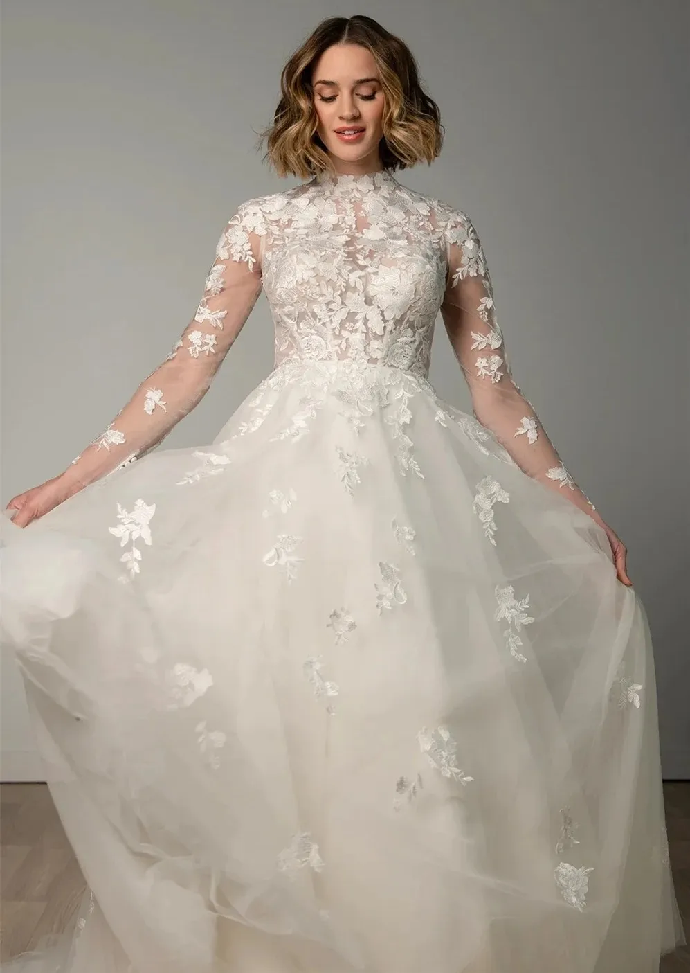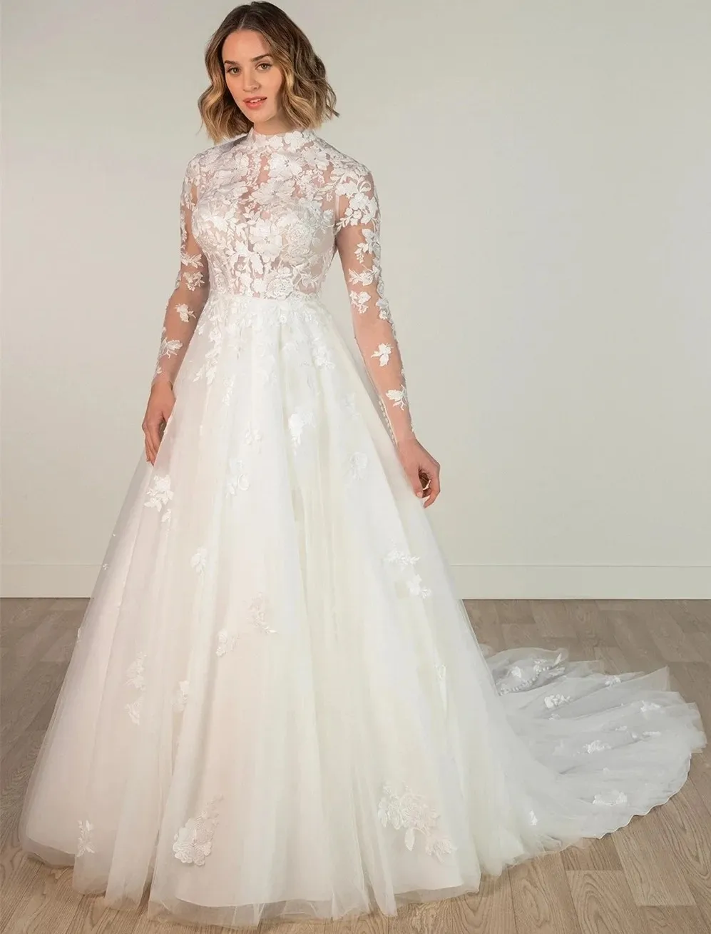 Elegant A-line Lace Wedding Dress 2026 High Neck Lace Flowers Appliques Tulle Backless Bride Bridal Gowns Vestidos De Noiva