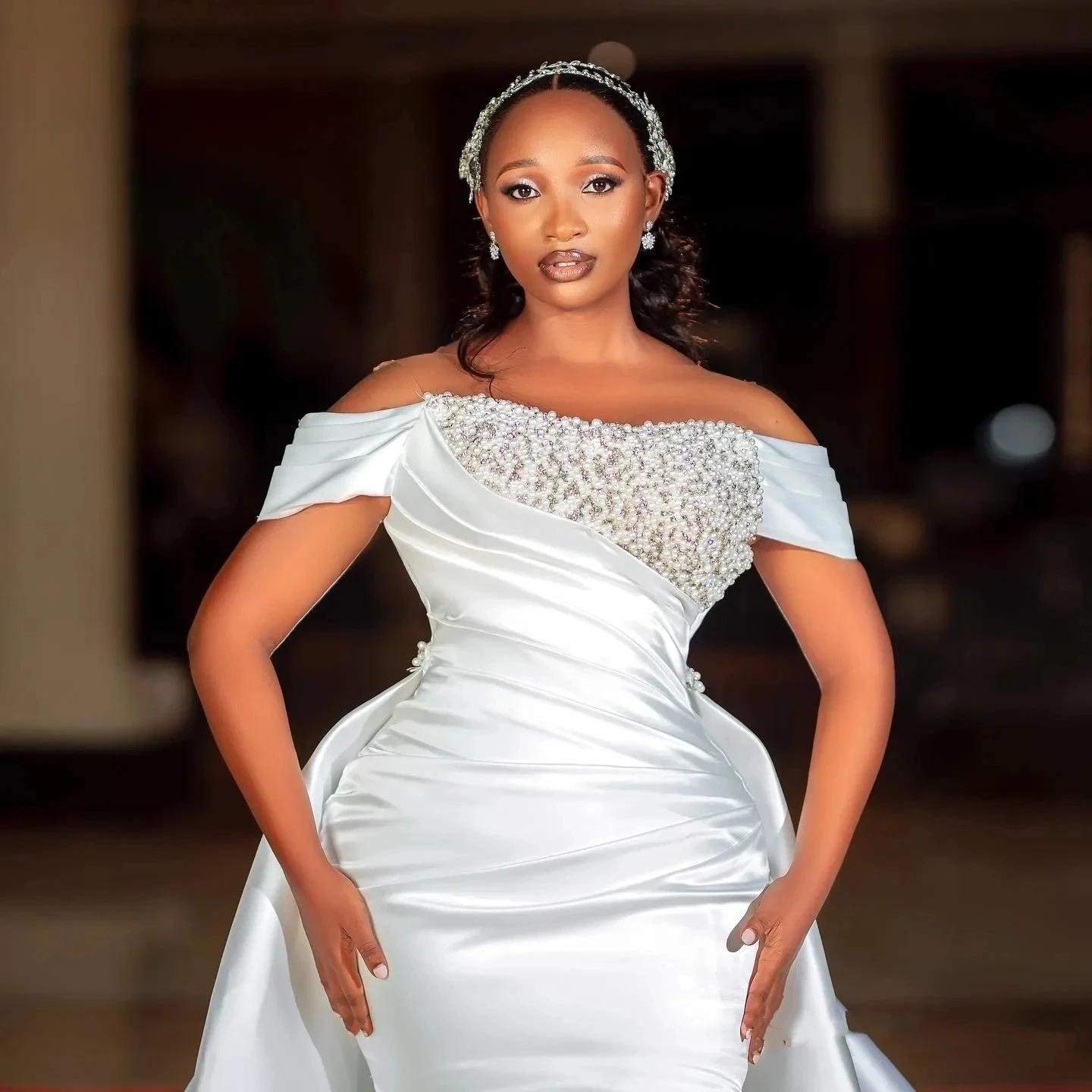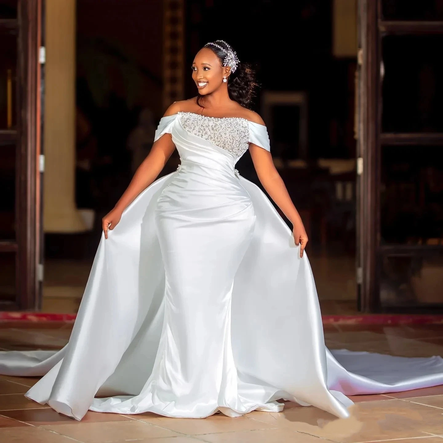 Elegant Mermaid Wedding Dress 2026 Detachable Train Off the Shoulder Beadings Pearls Sleeveless Satin Bride Bridal Gowns African