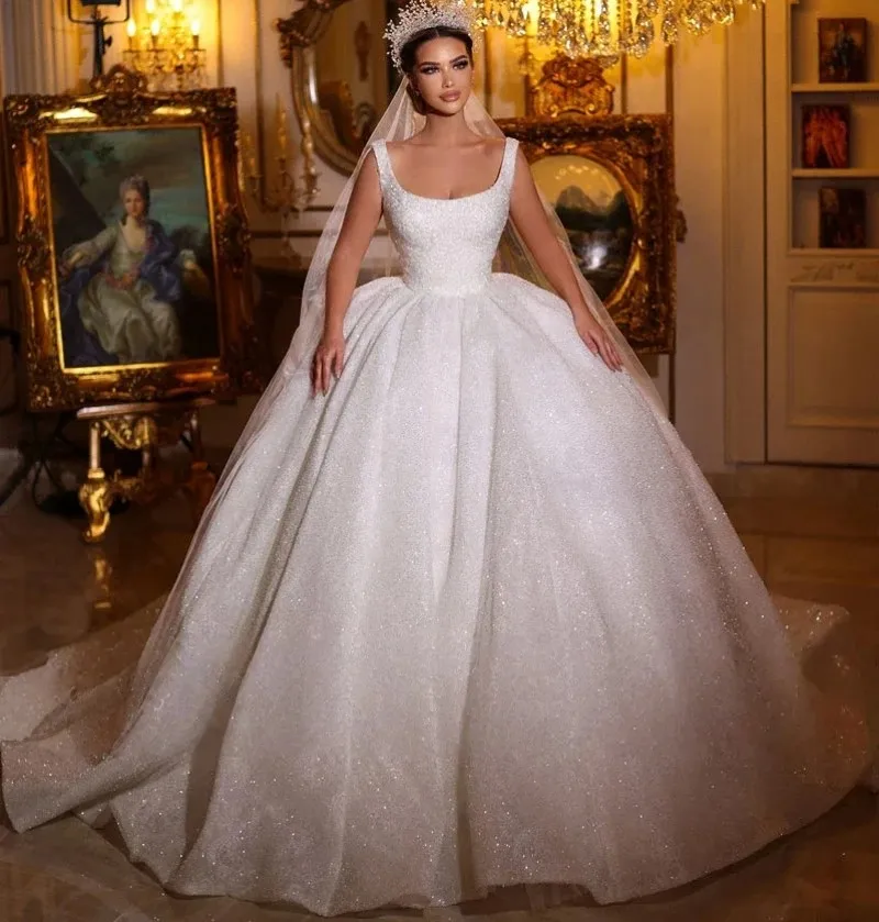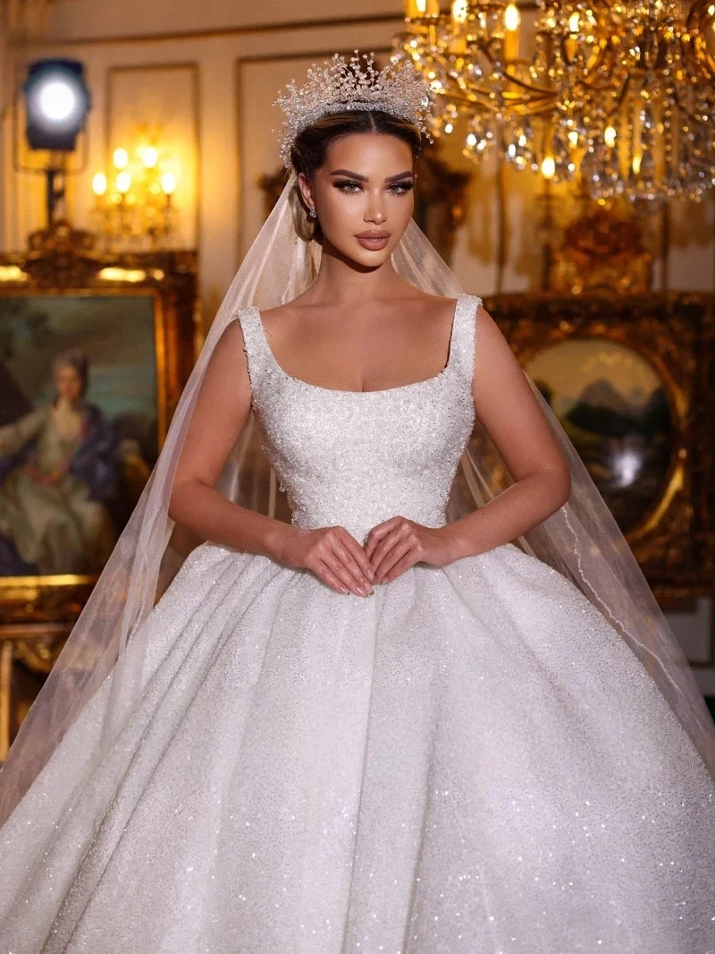 Gorgeous Church Wedding Dress 2026 Square Neck Straps Beading Pearls Sequins Backless Bride Bridal Gowns Dubai Vestidos De Noiva