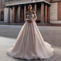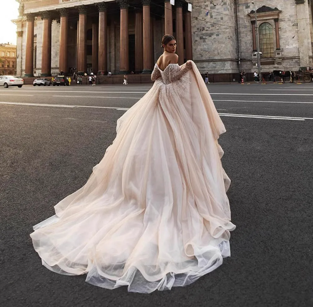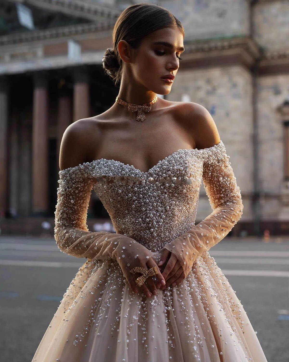 Luxury Champagen Wedding Dress Off the Shoulder Long Sleeves Pearls Beads Sweep Train Bridal Bride Gown Women vestidos de novia