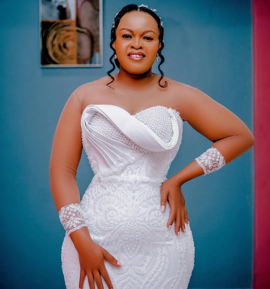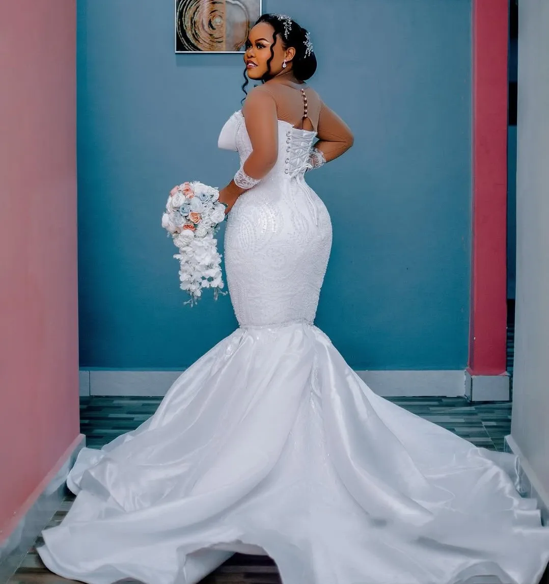 Plus Size African Wedding Dress Bridal Gowns For Bride Mermaid Sheer Neck Long Sleeves Beaded Tiered Luxury Lace Pearl Vestidos