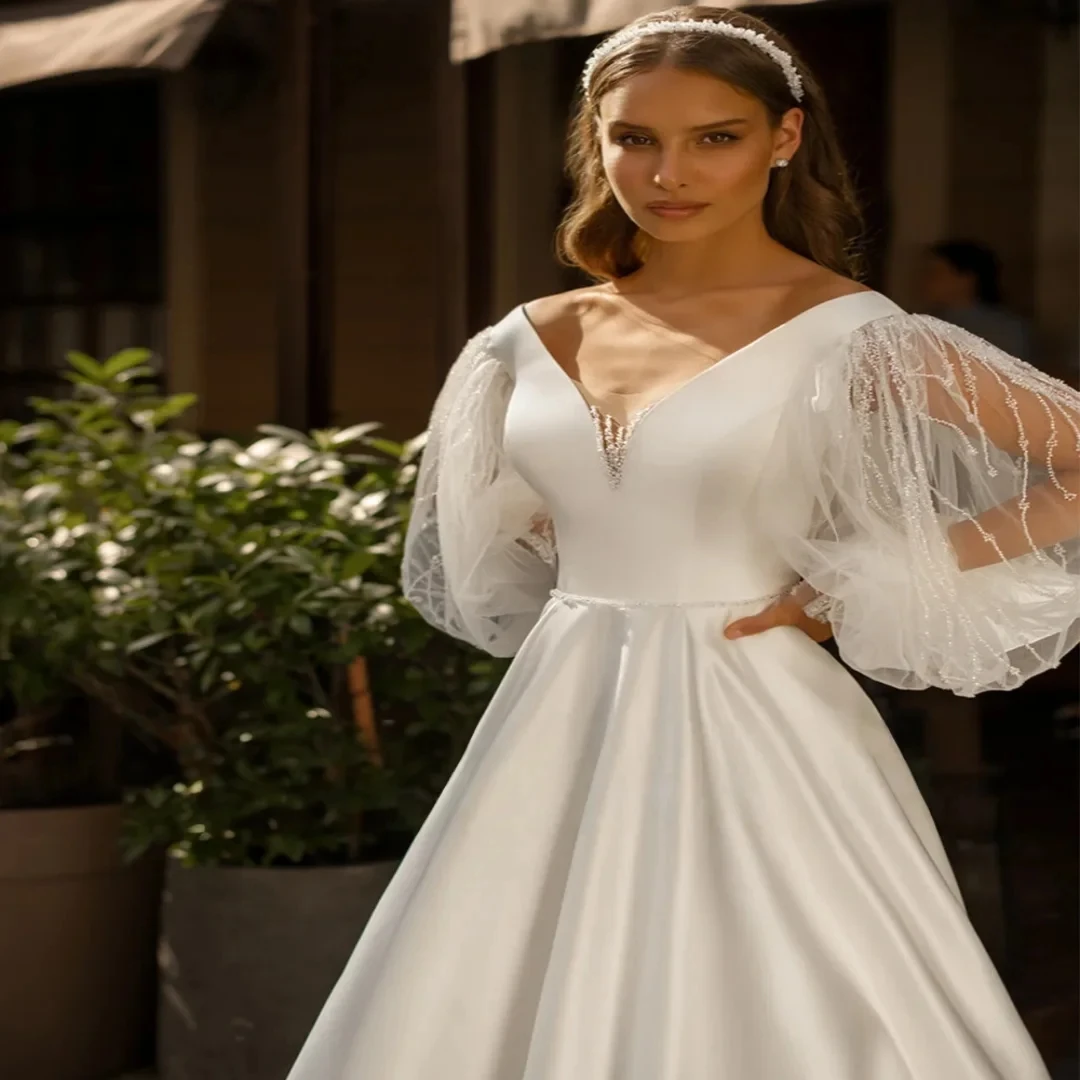 Romantic Satin Wedding Dresses 2026 Puffed Sleeves V Neck Beading Lace A Line Bride Dress Bridal Gowns Vestidos De Noiva