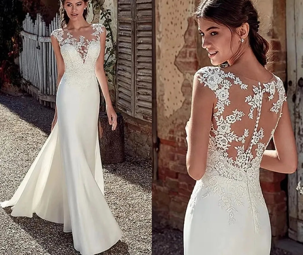 Sexy Beach Wedding Dresses 2026 Sheer Neck Lace Appliques Satin Mermaid Bride Dress Bridal Gowns Boho Vestido De Noiva