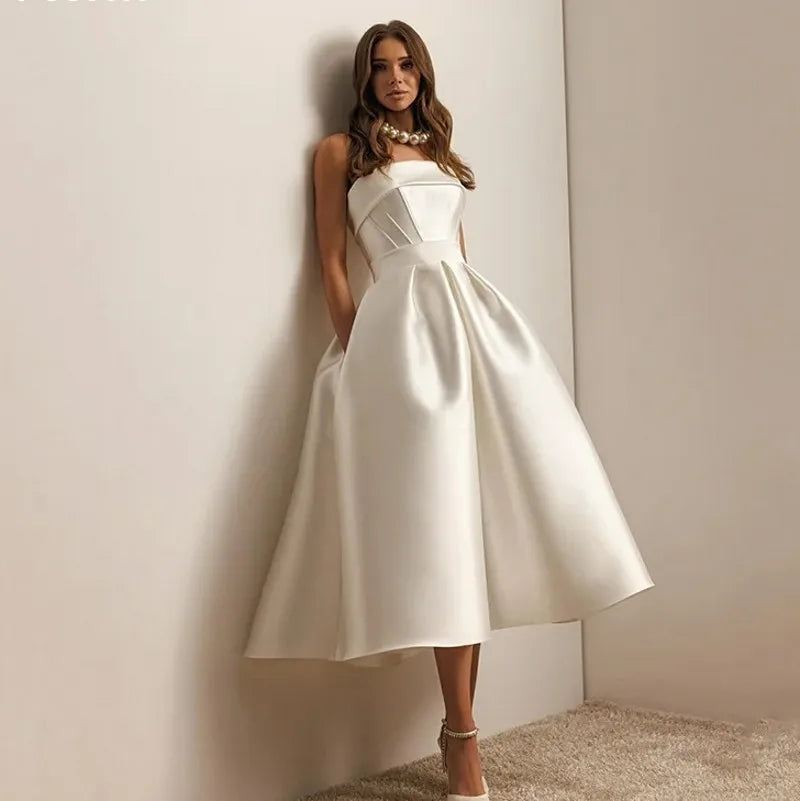 Sexy Elegant A-line Satin Wedding Dresses Mid-calf Sleeveless Bridal Gown Backless Formal Bridal Gowns vestidos de novia