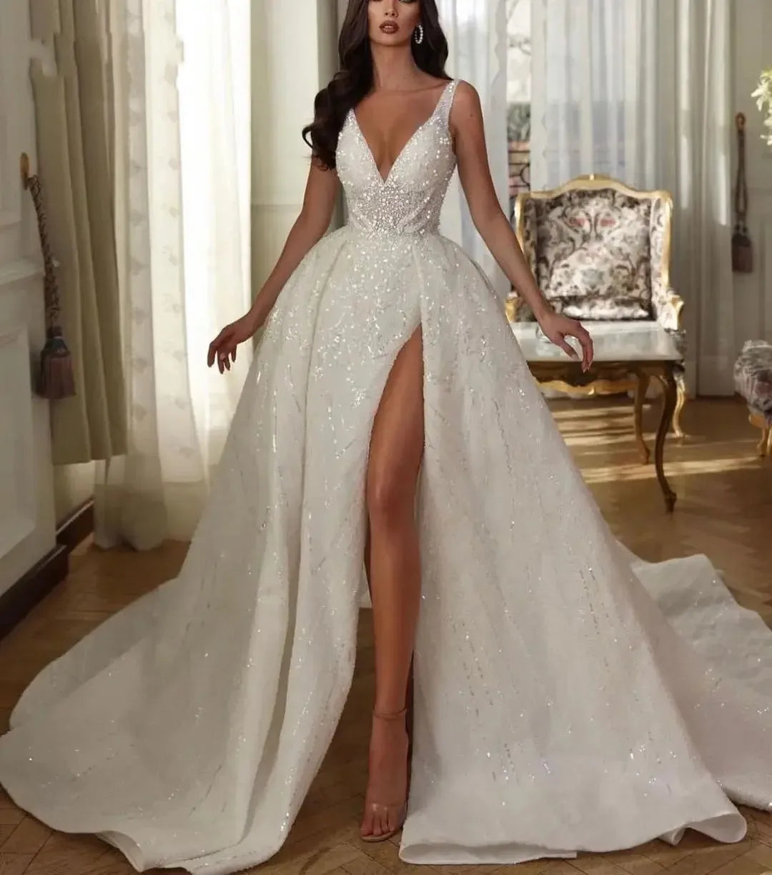 Shinny Ball Gown Wedding Dress 2026 V Neck Sequins Straps Appliques Lace Slit Pearls Bridal Bride Gown Women vestidos de novia