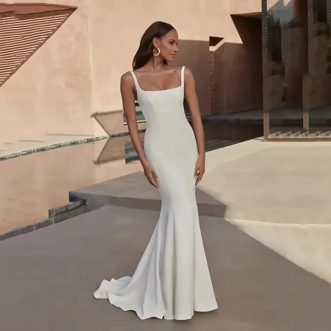 Simple Mermaid Wedding Dresses Straps Square Neck Backless Soft Satin Court Train Bride Dress Bridal Gowns Sweep Train Vestidos