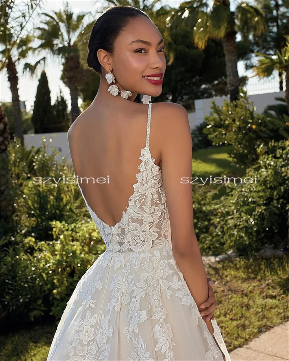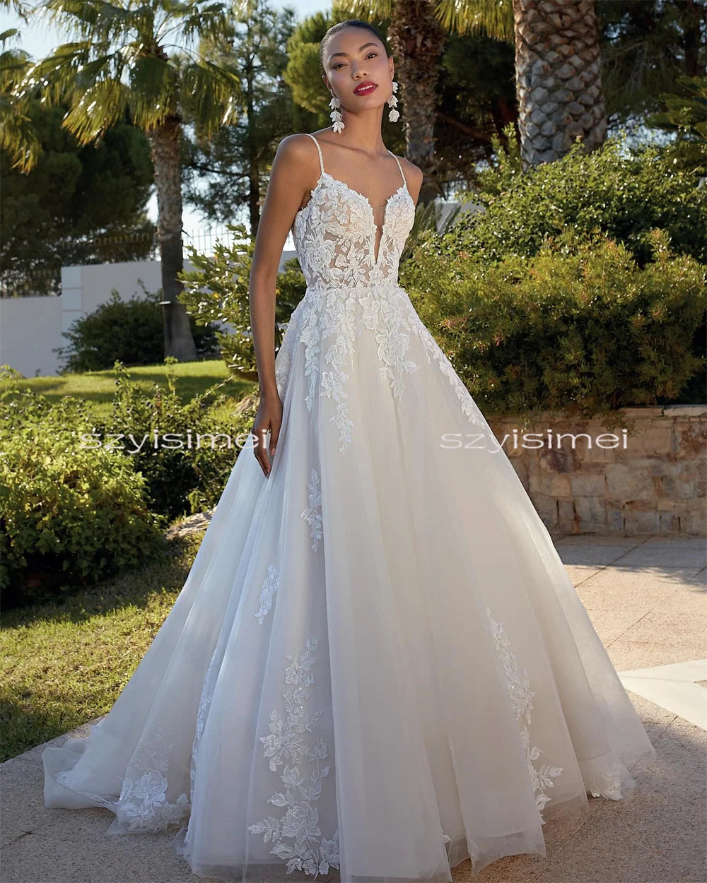 Spaghetti Straps V Neck Wedding Gown For Women Customized Wedding Dress Sweep Train Evening Bride Dresses vestido de noiva
